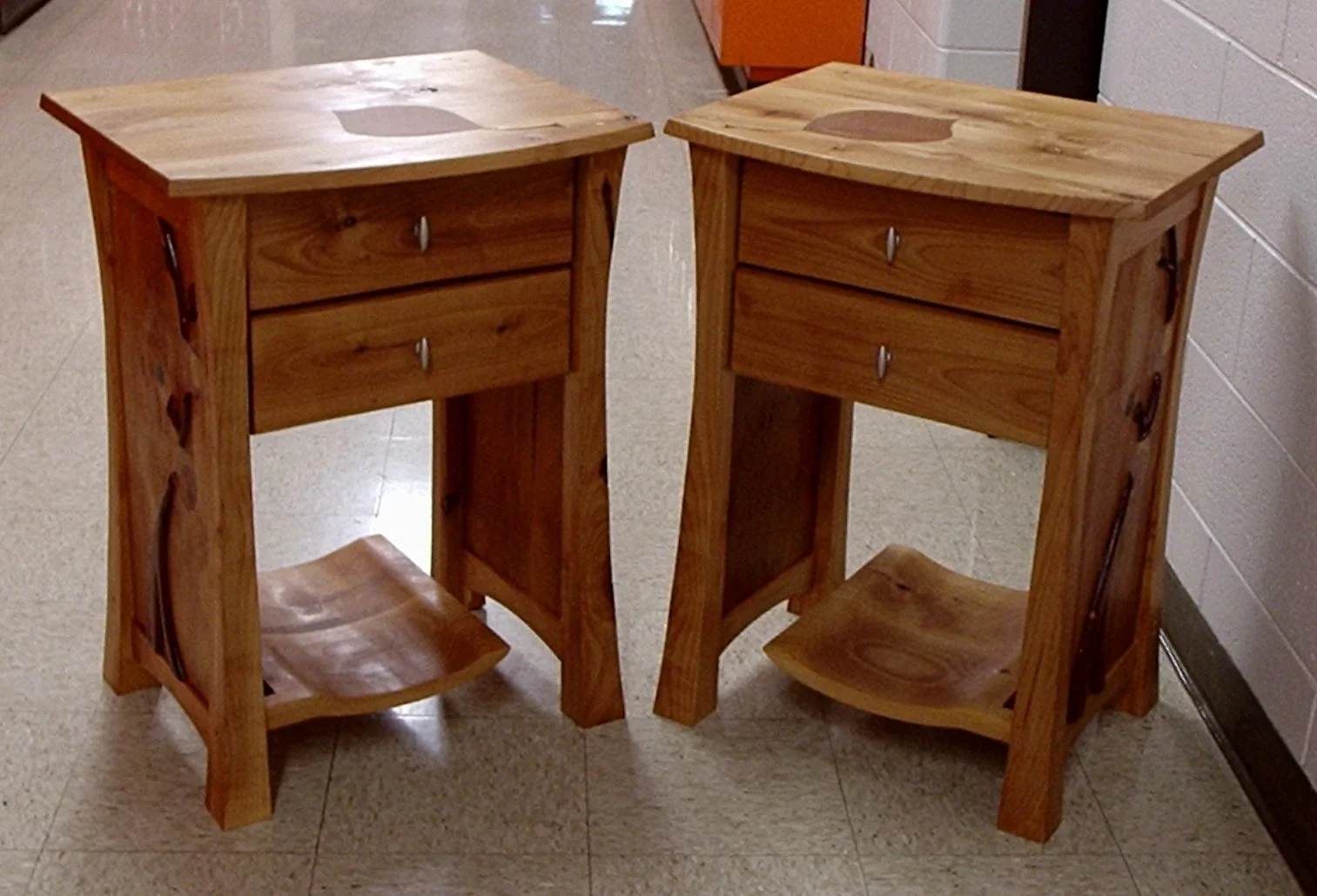 The drawer fronts and side panels are accented with contrasting hardwood inlays, each cut and fitted by hand to create a design that is both organic and refined. Subtle shaping in the curved legs and lower shelf, combined with clean joinery and a smooth hand-applied finish, make these nightstands as functional as they are beautiful.